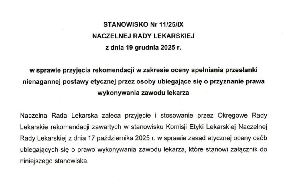 w sprawie: przyjęcia rekomendacji w zakresie oceny spełniania przesłanki nienagannej postawy etycznej przez osoby ubiegające się o przyznanie prawa wykonywania zawodu lekarza